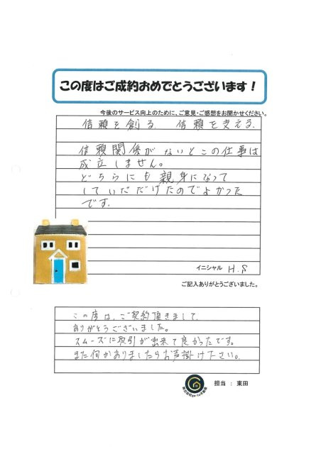 この度はご契約いただきましてありがとうございました。スムーズにお取引が出来て良かったです。また何かありましたらお声掛けください。