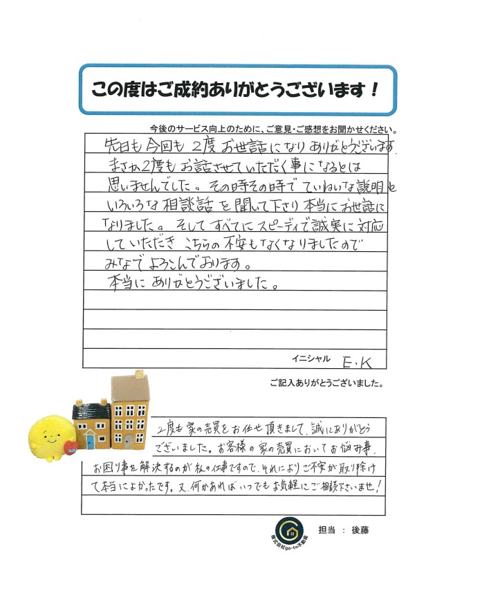 2度も家の売買をお任せ頂きまして、誠にありがとうございました。お客様の家の売買においてお悩み事、お困り事を解決するのが私の仕事ですので、それによりご不安が取り除けて本当によかったです。又、何かあればいつでもお気軽にご相談下さいませ!