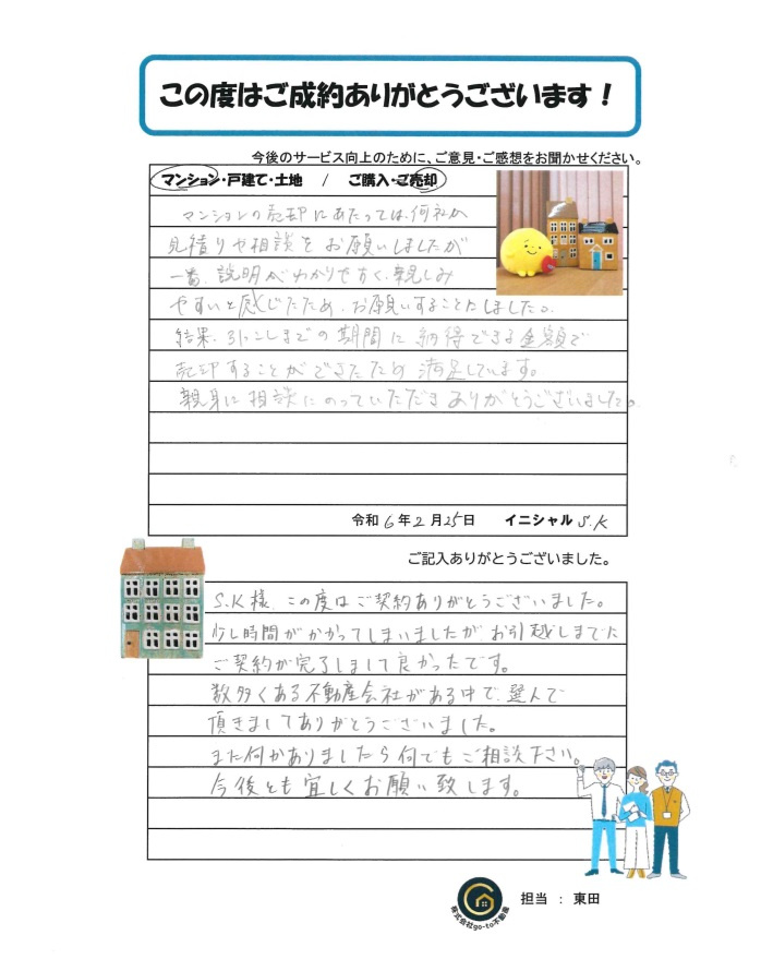 S・K様 この度はご契約ありがとうございました。少し時間がかかってしまいましたが、お引越しまでにご契約が完了しまして良かったです。
