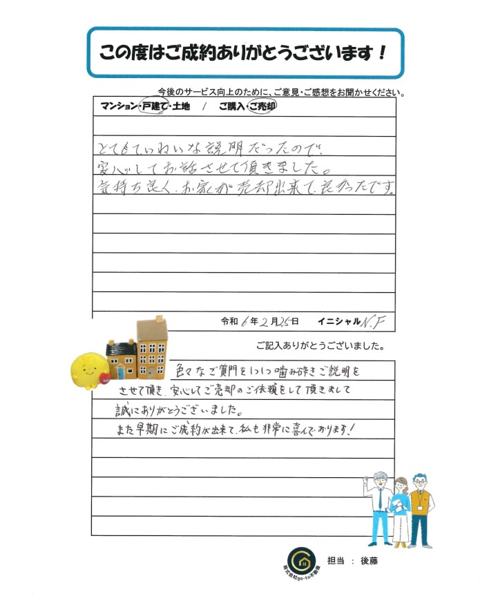 色々なご質問を1つ1つかみ砕きご説明をさせて頂き、安心してご売却のご依頼をして頂きまして誠にありがとうございました。 また早期にご成約が出来て、私も非常に喜んでおります!