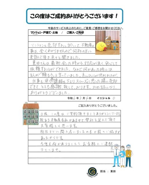東田さんは最初会った時から対応が良く、安心して依頼することができました。なので、何かあった時には主人が「頼もう」と言っていました。急にひっこしが決まりましたが、仕事も早く常に連絡を下さりスムーズに思った様に売却できて、とても感謝致しております。