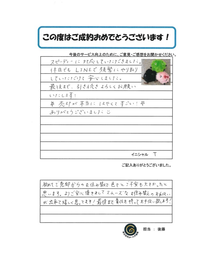 初めてご売却からのお住み替えで、色々とご不安も大きかったと思います。よりご安心頂きましてスムーズなお住み替えのお手伝いが出来て嬉しく思っています!最後まで責任を持ってお手伝い致します!