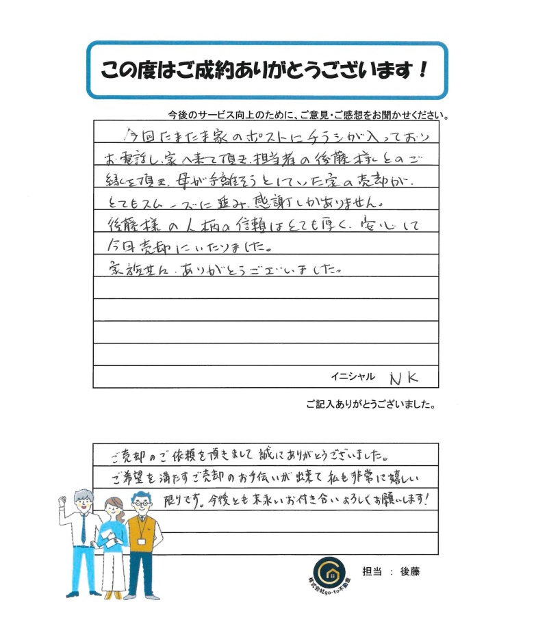 今回たまたま家のポストにチラシが入っておりお電話し、家へ来て頂き、担当者の後藤様とのご縁を頂き、母が手離そうとしていた家の売却がとてもスムーズに進み感謝しかありません。後藤様の人柄の信頼はとても厚く、安心して今日売却にいたりました。 家族共にありがとうございました。