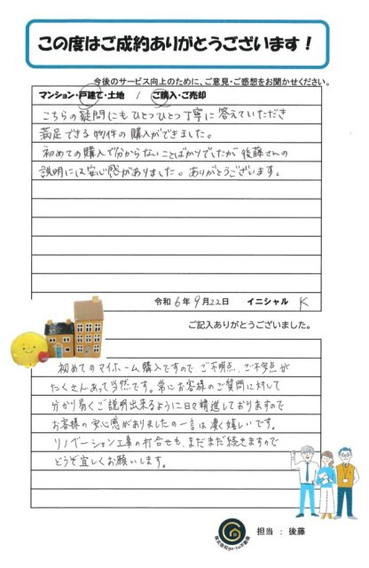 こちらの疑問にもひとつひとつ丁寧に答えていただき、満足できる物件の購入ができました。 初めての購入で分からないことばかりでしたが、後藤さんの説明には安心感がありました。 ありがとうございます。