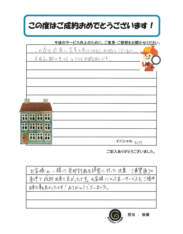 お客様と一緒に売却計画を綿密に行った結果、ご希望通りの条件で成約出来て良かったです。お客様にとって良いサービスをご提供出来た事も良かったです!ありがとうございました。