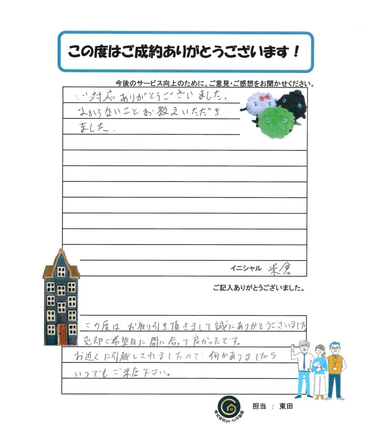 この度はお取引き頂きまして誠にありがとうございました。 売却ご希望日に間に合って良かったです。 お近くに引越しされましたので、何かありましたらいつでもご来店下さい。